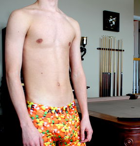 The photo captures a well-built man standing alone in an indoor setting. The room appears rather bare, with only a plain wall visible in the background. The man is shirtless, revealing a muscular chest and stomach. His abdomen is sculpted, displaying an impressive six-pack that highlights his strong, toned physique. He is wearing nothing but a pair of briefs or underpants, which are snugly fit around his waist, further emphasizing his defined muscles. The lighting in the room enhances the contours of his body, casting subtle shadows that draw attention to his muscular form. His shoulders appear broad and strong, contributing to his overall athletic build. The color of his skin is consistent throughout the image, with no visible tattoos or marks. His navel is also noticeable in the center of his well-defined abdomen. Despite his muscular frame, his stance is relaxed, suggesting a confidence and comfort in his own skin. It's a striking image that showcases physical fitness and personal wellness.