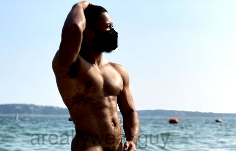 The image captures an outdoors scene in a picturesque setting. The focus is on a bare-chested man, whose muscles are well-defined, evidence of physical fitness. He is outside, under a sky that's presumably clear given the ample natural light captured in the image. The man is near water, suggesting a beach or a similar location. His attire suggests that he is in swimwear, possibly preparing for or just coming from a swim. This scene seems to be taken during summer, a time when such outdoor activities are common. The presence of the man in swimwear, the beach, and the water all point to a vacation, a time to relax and enjoy the leisurely activities. The man's apparent health and physical fitness might suggest an active lifestyle, possibly with regular swimming exercises contributing to his muscular build. The man's chest is prominent in the picture, possibly due to his bare-chested state and muscular physique. His body is likely tanned from the sun, suggesting he spends a significant amount of time outdoors. The image exudes a relaxed, summer vibe, the epitome of a beach holiday.