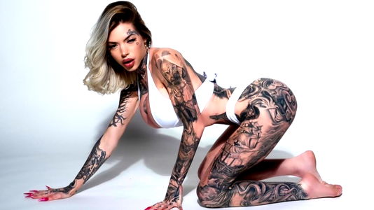This photograph captures a striking image of a young woman who possesses the striking allure of a professional model. Her face, with its flawless skin and sharp, well-defined features, exudes a captivating intensity that instantly draws the viewer's attention. The long, flowing strands of her hair add a touch of elegance to her overall look, making her appear both sophisticated and intriguing. The woman's body is adorned with various tattoos, each one a testament to her personal tastes and experiences. The ink on her skin forms intricate patterns, adding to the edgy and artistic vibe that she exudes. The tattoos appear to be well-done, their colors vibrant against her flesh. She wears a cover-up, which reveals her shoulders and part of her abdomen, adding a touch of sensuality to the photo. Her flat stomach and toned shoulders hint at a disciplined fitness regimen. The clothing she wears complements the overall aesthetic of the photo shoot, blending seamlessly with the theme. The shot is an excellent representation of a fashion model's charisma and the allure of body art in contemporary culture.