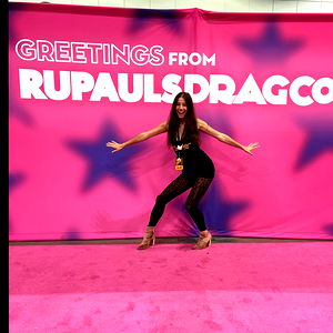 This image presents a young woman, approximately 21 years old, participating in a dance. Her face, captured in a medium close-up, shows a focused and passionate expression. She is dressed in vibrant clothing, with dominant shades of pink and red, which add to the energetic atmosphere of her performance. The woman's footwear is particularly notable, suggesting she might be performing a specific type of dance that requires special shoes. Her knees are slightly bent, indicating that she might be in the middle of a dance move or preparing to make one. Her position on the floor hints at a dynamic, perhaps even acrobatic element to her dance routine. The setting seems to be a dance floor or a similar surface suitable for dancing, as the woman's position implies a connection with the ground, necessary for many dance forms. Overall, the image captures a moment of intense physical activity, combined with a strong emotional expression, characteristic of many dance performances.