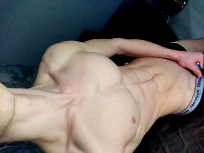 This image showcases an indoor scene focusing on a man displaying his muscular physique. The man, who is bare-chested, exhibits an impressive muscular definition. His chest muscles are particularly prominent, suggesting a regular and intense workout routine. The abdominal region or stomach area also highlights well-defined muscles, hinting at a strict fitness and dietary regimen. The man's limbs, both arms and legs, are prominently muscled. His wrists and elbows, which are the joints of his arms, are also quite noticeable, showing off his strong and well-toned muscles. His flesh appears healthy and firm, indicative of his overall physical fitness. Despite the absence of any clothing covering his upper body, the man seems comfortable and confident in this indoor setting. His posture and physical condition suggest that he might be engaged in some form of physical training, possibly bodybuilding or a similar fitness discipline. The image exudes a strong sense of dedication, discipline, and commitment to physical health and wellness.