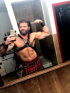 This image depicts a muscular man in his late forties, facing a mirror. He is standing indoors, most likely in a bathroom, as suggested by the presence of a mirror and the typical flooring of such a room. The man is shirtless, revealing a well-toned chest that speaks volumes of his fitness regimen. His face is in clear focus, carrying a serious expression that hints at determination and focus. He is standing against a wall that serves as the backdrop of the image. His clothing, probably a pair of trousers or workout shorts, can be seen but are not the main subject of the photo. On the floor, there seems to be a trunk or a chest, likely used for storage. The man's reflection in the mirror adds an interesting dimension to the photo, making it more engaging. Overall, the image exudes a strong sense of masculinity and determination, painting a vivid picture of an individual committed to fitness and health.