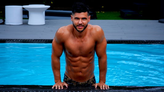 This image portrays a well-built male showcasing his muscular physique. The man, approximately in his early 30s, has a chiseled face with striking features. His chest, abdomen, and thighs are prominently displayed, revealing a toned body typically associated with a bodybuilder. His well-defined muscles, especially the abdominal muscles, are quite evident, demonstrating a high level of fitness and dedication to physical training. He is seen wearing a pair of briefs or swim briefs, which could suggest his profession or passion could be related to swimming or bodybuilding. The undergarment appears to be a protective type, possibly designed for athletic activities. The man's navel is also visible due to his attire. The backdrop appears to be a plain wall, perhaps indicative of an indoor setting, adding a sense of simplicity to the image. This allows the focus to remain solely on the man and his impressive physique. The man's elbow is also visible, slightly bent indicating a relaxed posture. Overall, the image is a powerful representation of physical fitness and health.