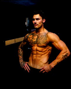 This image depicts a well-lit indoor setting where the primary focus is a man who appears to be in his early thirties. He has a distinguishing facial structure, marked by a range of features that highlight his masculinity. This includes his well-defined chest, which is partially visible in the image. An interesting aspect of the image is that the man seems to be interacting with a statue, as indicated by his elbow and hand position, suggesting that he might be holding or touching the statue. The statue is not fully visible, though, adding a sense of intrigue to the image. The background of the image features a wall, which blends well with the overall indoor setting, creating a harmonious interplay of elements. The various elements in the shot work together to create a scene that is both engaging and aesthetically pleasing, capturing the viewer's attention. The image seems to tell a story, keeping the viewer curious about the man's relationship with the statue and the context of their interaction.