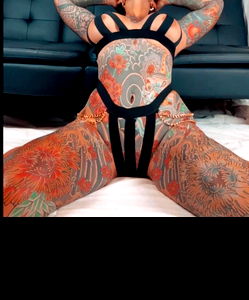 This is an indoor portrait of a woman, presumably the subject of the photograph. She is casually dressed, her outfit suggesting a relaxed setting. The clothing she wears is not elaborate, indicating that the focus is more on her as an individual, rather than her attire. The woman has a noticeable tattoo, which is prominently displayed. This tattoo adds an element of intrigue to the photograph and may be indicative of her personal style or beliefs. She is positioned against a couch, suggesting a domestic environment. The couch, or sofa, is a common feature in many homes, often associated with comfort and relaxation. Her limbs are visible in the shot, with her arms and thighs forming part of the composition. These features, along with her shoulder and joints, add a sense of realism and authenticity to the image. The human face is clear in the picture, allowing viewers to connect with the subject on a more personal level. The facial expression can convey a variety of emotions and thoughts, providing insight into the woman's mood or thoughts at the time of the photograph. This portrait effectively captures a moment in time, offering a glimpse into the woman's life.