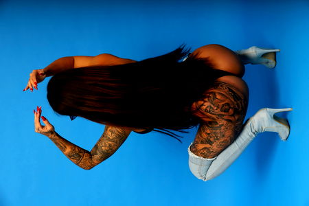 The image showcases a young woman, estimated to be around 25 years old, captured in an indoor setting. She is the main subject of the image, her striking presence dominating the frame. Her face, beautifully defined, is an epitome of youth and vitality. Her eyes, filled with an enigmatic expression, add a layer of depth to the image. She's elegantly dressed in lingerie, the clothing subtly highlighting her feminine curves. The lingerie clings to her body, accentuating her toned stomach, chest, and thighs. The details of her physique, from her limbs to her joints, are clearly visible, further enhancing the overall aesthetics of the picture. Adding an element of intrigue to the image is a tattoo that adorns her body. Artistically designed, the tattoo adds to her allure, making her even more captivating. Her skin, a canvas of flesh, seems to glow, adding a soft warmth to the image. The woman comes across as a professional model, her confident posture and the artful posing reminiscent of an art model. The image is a beautiful amalgamation of femininity, strength, and allure.