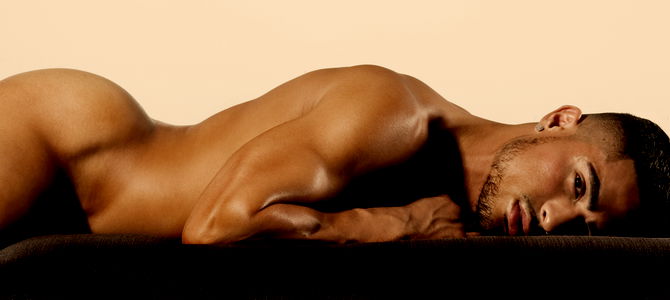 This is a high resolution, vertical image, primarily in black and white, showcasing a close-up of a shirtless man. He appears to be in his early thirties and sports a well-groomed beard. The photo captures his face in exquisite detail, from the creases on his forehead, down to his facial hair, highlighting the contours and shadowing of his features. The man's bare chest is also visible in the photograph, adding a sense of vulnerability and rawness to the image. The lack of color in the image makes his skin appear as different shades of grey, which further emphasizes the texture and muscular definition of his upper body. The focus of the image is undoubtedly the man's face, where his eyes, while devoid of color, seem to be full of emotion. The lighting in the image falls dramatically across his face, producing a chiaroscuro effect that enhances depth and evokes a powerful, almost melancholic mood. This image is a perfect example of a monochromatic portrait that captures the essence of its subject with striking clarity and intensity.