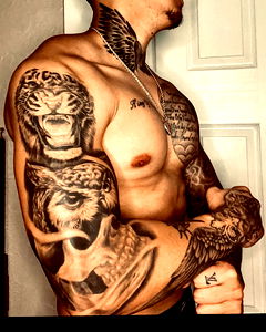 The image captures a fashionable, muscular man indoors, leaning against a wall. The man is shirtless, showcasing his well-defined chest and abdominal muscles. His skin is adorned with a variety of intricate tattoos, highlighting his personal style and individuality. His flexed arms reveal the strength in his elbow and wrist joints, providing a testament to his physical fitness. The man's outfit is complemented with a trendy hat, a noteworthy fashion accessory that adds to his stylish persona. His bare chest and stomach are in contrast with the clothing he wears on his lower body. The fine details of his body, such as the texture of his flesh and the contours of his muscles, are clearly visible. The man's elbow and shoulder are relaxed, suggesting a casual, laid-back atmosphere. The indoor setting, coupled with the muted tones of the wall he leans against, creates a calm and peaceful ambiance. Overall, the image showcases a blend of masculinity, fashion, and individuality, making it a visually compelling portrait.