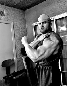 This black and white photograph captures a powerfully built man in the midst of an outdoor workout. His well-defined muscles, a testament to his dedication to physical fitness and bodybuilding, are on full display. He is bare-chested, his chiseled torso reflecting the light and adding a sense of depth to the image. The man, who appears to be in his late thirties, is in a power stance, with his elbows flexed and his hands resting on his hips, radiating strength and determination. He is surrounded by nature, with the rough bark of a tree trunk visible just behind him, suggesting that this is no ordinary gym setup but an outdoor training spot. The juxtaposition of his muscular human form and the natural scene around him adds an interesting contrast to the image. The shirtless man, with his impressive physique, stands out starkly against the softer background elements, creating a visually striking image that conveys the raw power and discipline of an outdoor bodybuilder.