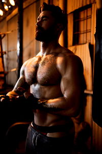 The image captures a shirtless man standing confidently in an indoor setting. His chiseled chest and well-defined muscles indicate a strong commitment to physical fitness. The man's face, bearing a stern and focused look, is highly prominent in the frame. His neck, complementing the robustness of his chest, also speaks volumes about his physical strength. The man seems to be in his prime years and exudes a masculine aura. The setting appears to be within a building, but the specifics of the surroundings are not vividly distinguishable. The lighting seems to be strategically focused on the man, thereby highlighting his muscular physique even more. His shirtless and bare-chested look seems to be in line with the overall theme of the picture, accentuating his musculature and masculine appeal. In conclusion, the image is a striking portrayal of a muscular, shirtless man in an indoor setting, exuding strength, determination, and a strong masculine aura. It could be part of a fitness campaign, a personal trainer's portfolio, or a character study for a role requiring physical prowess.