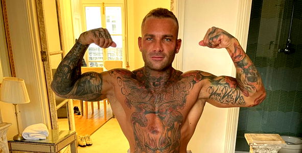 The image captures a moment indoors, with a man as the main subject. He is possibly in his early thirties, bearing a strong, chiseled face that is a testament to his masculinity. The man's eyes, filled with an indiscernible emotion, are captivating. His muscular build is prominently displayed; his bare chest and arms, revealing well-defined muscles that have been clearly honed through rigorous physical activity. His chest is not just a showcase of his physical strength, but also a canvas of tattoos. The intricate ink designs sprawled across his flesh add an element of intrigue to his persona. The tattoos are striking, suggesting that they may hold personal significance to the man. His elbows, slightly bent, suggest a relaxed or thoughtful stance. The backdrop of the image is a plain wall, unadorned and simple, which further draws attention to the man. The lighting is subtle, casting gentle shadows and accentuating the contours of his muscles. The man's expression, combined with his physical appearance, creates a powerful image that is both intriguing and compelling.