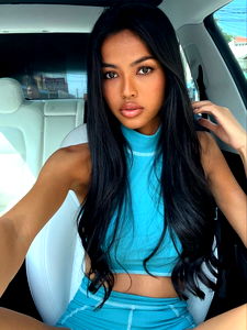 This is a captivating portrait of a young adult woman, approximately 24 years old, who could easily be a model. Her striking features are framed by her long, glossy black hair. The woman's gaze, directed slightly away from the camera, adds an intriguing touch to the overall composition. Her smooth, flawless complexion amplifies her youthful appearance. She is pictured indoors, with her bare shoulder peeking out from her clothing, hinting at a sense of style and elegance. The ambience of the setting is relatively serene, focusing attention solely on her. In the background, a car is also noticeable, possibly suggesting a luxury or fashion photoshoot. This might be an element of a larger narrative about the woman's lifestyle or occupation. The car, as a prop, adds a unique dimension to the photo, and the fact that it's indoors could denote a high-end showroom or an exclusive event. This image is a blend of fashion, youth, and lifestyle, capturing the essence of a modern, confident woman.