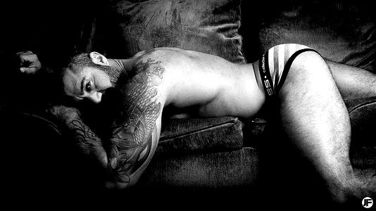 This image features a man standing against a wall indoors. The man appears to be in his prime, with a well-defined muscular structure that is prominently displayed. His chest, stomach, and arm muscles are particularly noticeable, hinting at a regular workout regimen. He is dressed in a simple pair of underpants, which could suggest a casual, at-home setting. The underpants are the only piece of clothing he is wearing, further emphasizing his physique. His bare skin also reveals a hint of body hair, adding a touch of natural masculinity to the image. His face is partially visible, featuring a striking beard that adds character to his overall appearance. His stern expression exudes a sense of confidence and strength. The wall behind him is plain and undecorated, keeping the focus solely on him. The indoor setting has a subdued ambiance, with the lighting subtly accentuating the man's body contours. This image may be part of a fitness or lifestyle photoshoot, or a candid snapshot capturing a moment of relaxation or contemplation.