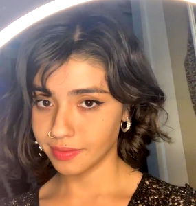 This is a close-up portrait photograph of a young lady, approximately around 19 years of age, taken indoors against a nondescript wall. Her face, the primary focus of the image, fills most of the frame. She has a delicate, youthful appearance with a well-defined chin and jawline. Her skin appears smooth and properly cared for. The lady has attractive, well-groomed eyebrows and long, impressive eyelashes, possibly enhanced with mascara. Her eyes are outlined with a subtle eye liner, accentuating their shape. Her lips are painted with a shade of lipstick and possibly some lip gloss, adding a touch of glamour to her overall look. She boasts a stylish, layered hairstyle with long, black, and possibly curtained hair, which compliments her fashion-forward appearance. The lady seems to be wearing some form of clothing, although it isn't clearly visible in the shot. Additionally, there might be a hint of a fashion accessory, perhaps a necklace, near her throat area. Overall, the photograph captures the essence of a modern, fashionable young woman, possibly taken as a selfie or a makeover portrait.
