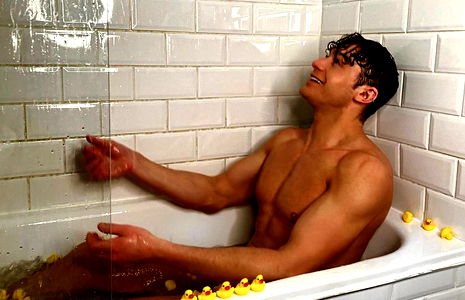 The image captures a striking scene of a shirtless man in the midst of a bathing ritual. The man, who seems to be in his early thirties, is captured in a moment of tranquility, with his face partially turned towards the camera. His bare chest, showcasing well-defined muscles, adds a sense of strength and robustness to the overall ambiance of the picture. The setting appears to be a bathroom, with the man immersed in water, possibly in a bathtub. It gives the impression of a modern, indoor space with a wall visible in the backdrop. The color theme leans towards blue, adding a calm and serene mood to the scene. Despite being indoors, the presence of water gives it a feeling reminiscent of a pool. This suggests that the man might be enjoying a moment of relaxation, almost as if he's swimming. This picture beautifully encapsulates a moment of solitude and peaceful self-care, portraying a strong, possibly athletic man indulging in a routine bathing ritual.