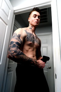 This image captures a man standing indoors, possibly in a building with a rustic charm. He is positioned against a wall that seems to have a vintage appeal, adding to the overall mood of the picture. He is wearing casual clothing, with the sleeves rolled up to his elbows, revealing his flesh-toned arms. His shoulders are relaxed, hinting at a sense of comfort and familiarity with the surroundings. The man's face, adorned with a beard, is indicative of a mature age. His eyes, partially obscured by shadows, seem to hold a story within. A window and a door are visible in the background, suggesting that the room might be well-lit during daytime. The window, possibly old-fashioned, complements the overall aesthetic of the room. Despite his casual attire, there's something intriguing about the man. His posture, combined with the indoor setting and subtle lighting, adds a sense of mystery and character to the image. The overall composition of the picture invokes a sense of nostalgia, making the viewer wonder about the man's story.