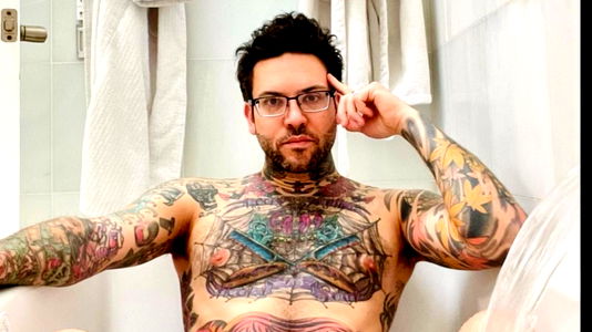 This image features a medium resolution close-up of a man estimated to be around 32 years old. The man is presented in a centered position with his face occupying a significant portion of the frame. His skin tone is light, with a texture that seems to suggest a natural flesh-like appearance. The man's face showcases a well-maintained beard, which further enhances the masculinity in his features. His facial expression is neutral, neither smiling nor frowning, which brings attention to his facial features including his prominent beard. The man is donning a piece of clothing, though the details are not entirely visible, we can infer that it is likely a casual attire fitting the overall relaxed demeanor of the subject. Interestingly, there's a subtle hint of music associated with this image, perhaps suggesting the man's interest or profession, or even the ambiance of the setting where the photo was taken. The dominant color scheme of the image is red, adding a warm and intense backdrop that contrasts with the man's relaxed demeanor. Despite the simplicity, the image carries a sense of depth and character, potentially inviting viewers to wonder about the man's story.