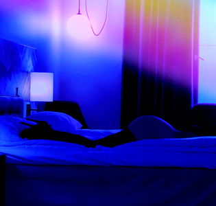 This is an indoor shot of a young woman, taking up most of the frame. She is the focal point of the image, appearing to be in her late teens or early twenties. The woman has a mesmerizing presence, her features sharply defined and captivating. Her face is oval-shaped with a high forehead, prominent cheekbones, and a distinct chin. She has full, well-defined lips that are slightly parted, and a slender, elegant throat. Her eyes are partially hidden beneath long, thick eyelashes, adding to her allure. Her hair is long, flowing down past her shoulders, and appears soft and well cared for. The woman is dressed in clothing that complements her overall look, although specific details about her outfit are not discernible from this perspective. The color violet seems to be a prevalent theme in this image, perhaps from the lighting or her clothing, adding a sense of calm and serenity to the scene. The woman exudes a quiet confidence and beauty, making the image both intriguing and aesthetically pleasing.