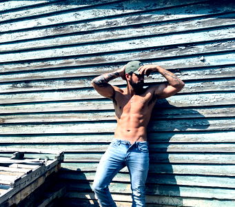 The image captures an indoor setting featuring a young man, approximately 29 years old, standing against a plain wall. The most striking aspect of his appearance is his well-defined musculature, suggesting a consistent fitness regimen. His torso, bare of any clothing, is a canvas for several distinctive tattoos. The man's face is a testament to a careful grooming routine, evidenced by his impeccably maintained beard. He exudes a sense of confidence and ruggedness, further accentuated by his shirtless appearance. Despite the simplicity of his surroundings, his physical presence makes him undeniably the focal point of the image. The room wherein he stands is minimally furnished, with a bed faintly visible in the background. The wall behind him is unadorned, with the color and texture serving as a neutral backdrop that further emphasizes his physique and tattoos. It seems as though the individual is posing for a photograph, perhaps a personal portrait, or a promotional image for a fitness or body art related endeavor.