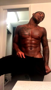 This photo captures a portrait of a young man, estimated to be around 27 years of age, standing against a wall indoors. His face, the main point of focus, is strong and well-defined, with features suggesting a male gender. He seems to be in the prime of his youth, exhibiting a muscular physique that exudes strength and vitality. His bare chest reveals a well-toned stomach and a muscular neck, suggesting a regular fitness regimen. The man's skin has an earthy tone, giving an impression of robust health and vitality. His fashion accessory, possibly a necklace or pendant, adds a hint of personal style to the otherwise simplistic setting. The indoor lighting casts a soft glow on his skin, enhancing the contours of his muscles and lending an intimate, personal touch to the portrait. The man's intense gaze engages the viewer directly, adding an element of connection and intrigue to the image. The backdrop, a simple wall, provides a neutral canvas that emphasizes the subject, making this a compelling study of the human form and personal strength.