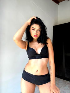 This photograph captures a young woman, likely in her mid-twenties, in an indoor setting. She is a professional model, standing against a plain wall that serves as the backdrop for this photo shoot. Her outfit seems to be designed for a lingerie campaign, featuring a lingerie top, underwear, and a crop top. The clothing is close-fitting and highlights the model's defined waist, abdomen, and hips. The model's pose accentuates her toned stomach and thighs, and the undergarment she's wearing could be from a high-end brand like Agent Provocateur. The lingerie top, possibly a brassiere, covers her chest while leaving her shoulders bare. A hint of a navel can be seen, adding a sensual undertone to the photograph. The model's long hair is arranged to fall freely over her shoulders, framing her face. She has a strikingly beautiful face, which is the focus of the photograph. This photo seems to be part of a larger collection, potentially for a fashion or fetish model's portfolio. The woman's confident stance and the intimate nature of her clothing suggest she's comfortable with her body and with modeling.