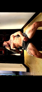 This image captures a moment in an indoor setting, highlighting a young adult male in his early thirties. The man's chiseled physique draws attention, with his well-defined chest muscles, robust abdomen, and strong arms being particularly prominent. His bare-chested upper body allows for a full view of his muscle definition, showcasing the results of significant physical training and conditioning. The man's skin is adorned with an array of intricate tattoos, adding an artistic element to the image. These tattoos appear to cover a significant portion of his chest and stomach, extending to his elbows and wrists. The man's face is partially obscured but still visible enough to reveal a well-groomed beard that adds to his masculine appearance. The backdrop of the image is a plain wall, allowing the man and his physique to remain the central focus. Overall, the image portrays a strong, well-built male figure with interesting body art.